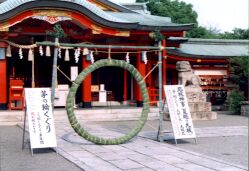 「輪越(わごし)祭」「茅輪くぐり」ともいわれます。茅とは、ち、かや、ちがや、 で、菅(すが)、薄(すすき)などの多年生草木のことです。 ー茅輪の由来ー 神代の昔、武塔(ぶとう)神”素戔嗚尊(すさのおのみこと)”が、南海の方へお出になる途中、 ある所でお泊まりになろうとして、土民の蘇民将来(そみんしょうらい)、巨旦将来 (こたんしょうらい)という兄弟に宿を求められた。その時、弟の巨旦将来は 裕福な身であったにも拘わらず宿を拒んだのに対し、兄の蘇民将来は、貧しい身であったが 尊(みこと)をお泊めし、栗柄(がら)を以って座を設け、栗飯を饗して御待遇申し上げた。 その後、年を経て尊は再び蘇民将来の家を訪れ、「もし天下に悪疫が流行した祭には、ちがやを 以って輪を作り、これを腰に付けておれば免れるであろう。」と教え給うた。 この故事に基ずき、蘇民将来 と書いて、これを門口に張れば、災厄を免れるという信仰が生じ、また祓の神事に茅輪を作ってこれを くぐり越えるようになったのである。