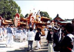 和田、平井、伏尾、太平寺、 大庭寺の地車5台 野田尾、小代の子供御輿だんじり2台の計7台 朝9時30分頃から入りはじめ、境内でお祓いを受け休憩の後 11時30分頃から順次出発していきます |